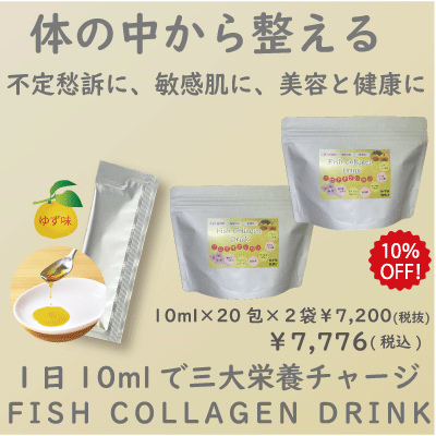 1日の疲れを取る為に、何か栄養ドリンク飲みますか?緑風のフィッシュコラーゲンドリンクは、無防腐剤、無着色料、脂肪分0.0001のこだわり。ビタミンC、B群、ローヤルゼリーなど15種が1包に