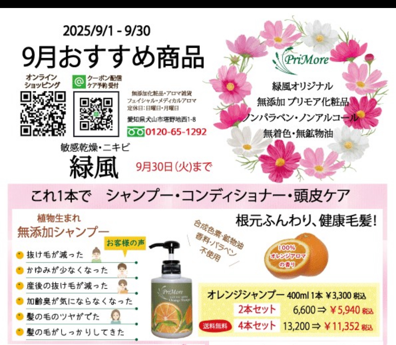 頭皮の乾燥、痒み、枕への抜け毛など、髪の毛の悩みを解消するオレンジシャンプーが10%OFF 9/30まで。 2025.09.25 1本でシャンプー、コンディショナー、頭皮ケアが出来ます。合成界面活性剤フリー、パラベンフリーは、頭皮にやさしく、痒み、抜け毛を防ぎます。毎日使用するシャンプーはこだわりましょう