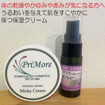 無添加のかゆみ止めで助かっています。体がとても乾燥しやすく、アトピー、アレルギー持ちです。お風呂から出るとかゆくなって赤くなり、クリームを塗ってもすぐにしわしわになる状態でした。プリモアの先生に相談すると、ミルキークリームを勧められサンプルを頂きました。お風呂後の体にかゆみのあるところを重点的に何度も重ね付けをしたら、かゆみがすっとおさまり赤みもとれました。父も乾燥によるかゆみで仕事中も我慢できないということで勧めてみたところ、次の日の夜まったくかゆみがなかったと大喜びでした。さらさらとした使用感でベタつかないので、すぐに洋服が着れるのがいいです。アトピーやニキビにもいいそうなので、腕のアトピーや背中のニキビにもたっぷり使っています。赤ちゃんから大人、アトピーの方まで使えると聞いたので、安心して使えます。無添加のかゆみ止めで助かっています。